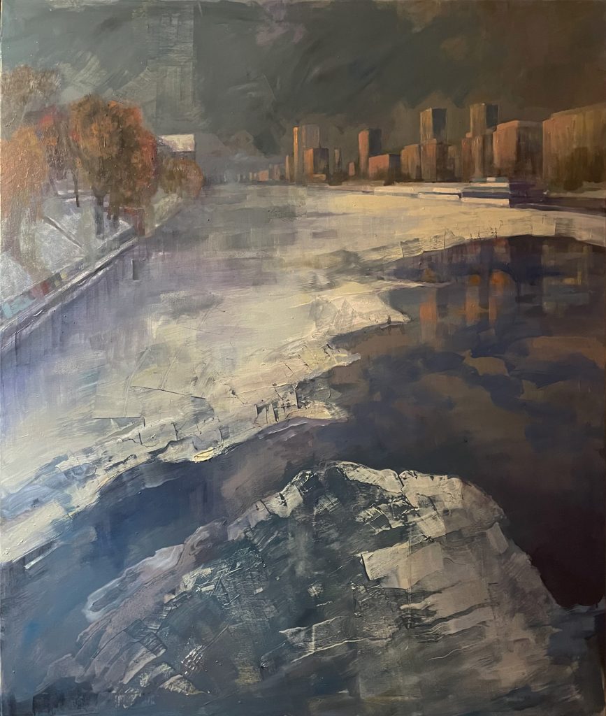 An seltenen Wintertagen trägt die Spree Eis. Von der Oberbaumbrücke erscheint der Himmel über der Innenstadt dunkler als die Oberfläche des Wassers.