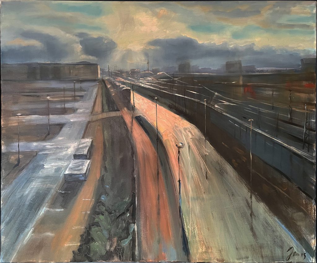 Gleise zum Ostbahnhof Öl auf Leinwand · 120 x 100 cm · 2015 Ein ausgestorbener Parkplatz am Sonntagnachmittag. In der Arena ist es still und von East-Side-Mall und Edge existieren bestenfalls Pläne. 4.500 €
